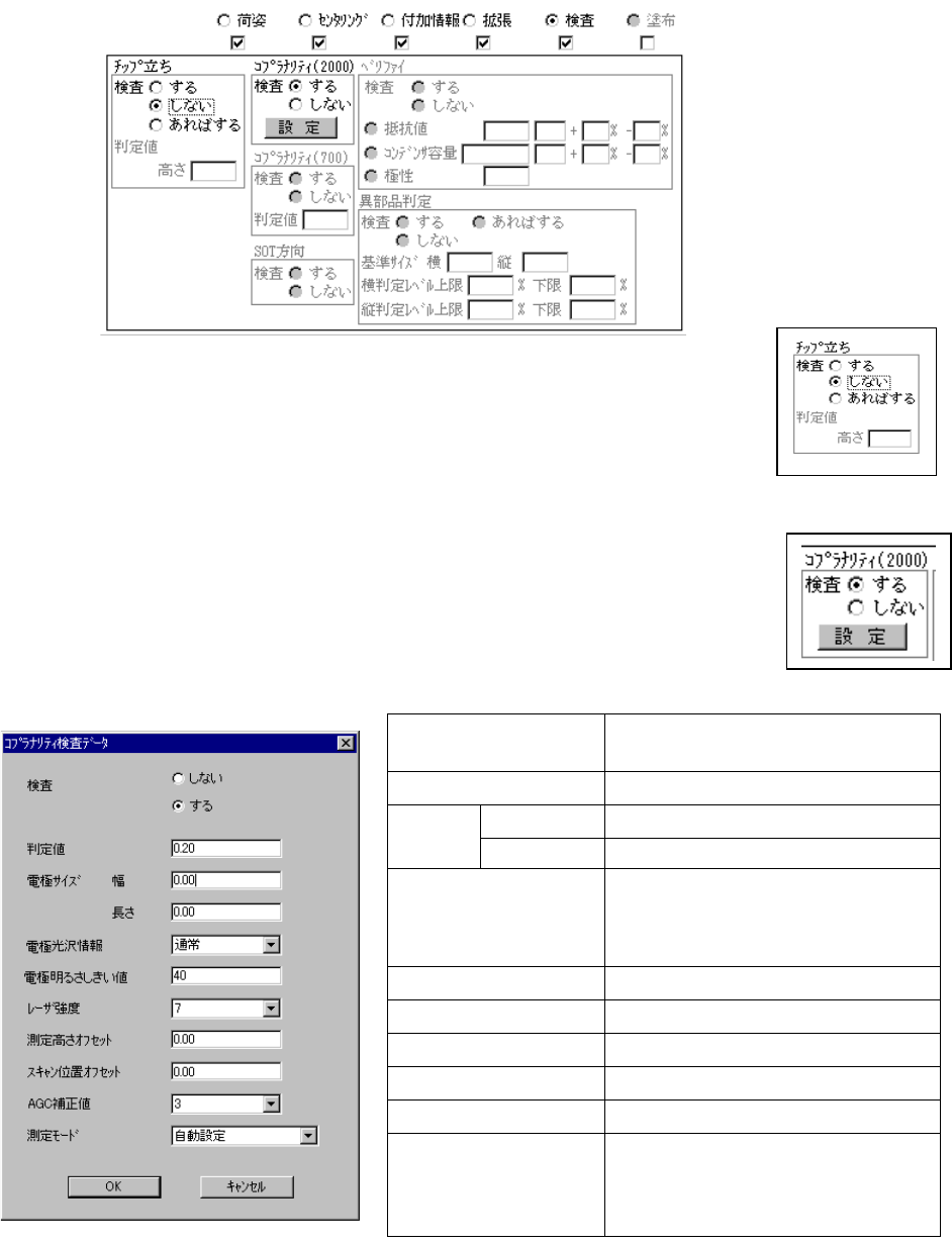 4 - 78 検 査 コプラナリティ 検査をするかしないかを選択しま す。 判定値 判定値を設定します。 幅 電 極 サイズ の幅を設定します。 電 極 サイズ 長さ 電 極 サイズ の長さを設定します。 電極 光沢情報 電極 光沢情報を設定します。 通常 光沢あり 光沢なし 電極 明るさしきい値 電極 明るさのしきい値を設定します。 レーザ強 度 レーザ の強度を設定します。 測定高さ オフセ…