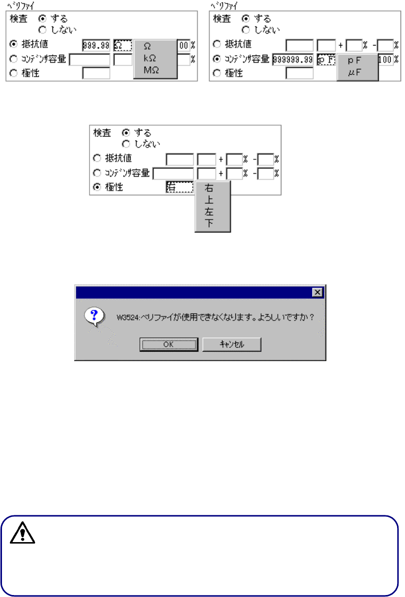 「抵抗値」または「コンデンサ容量」を指定した場合は、判定値・単位・許容誤差の上限/下