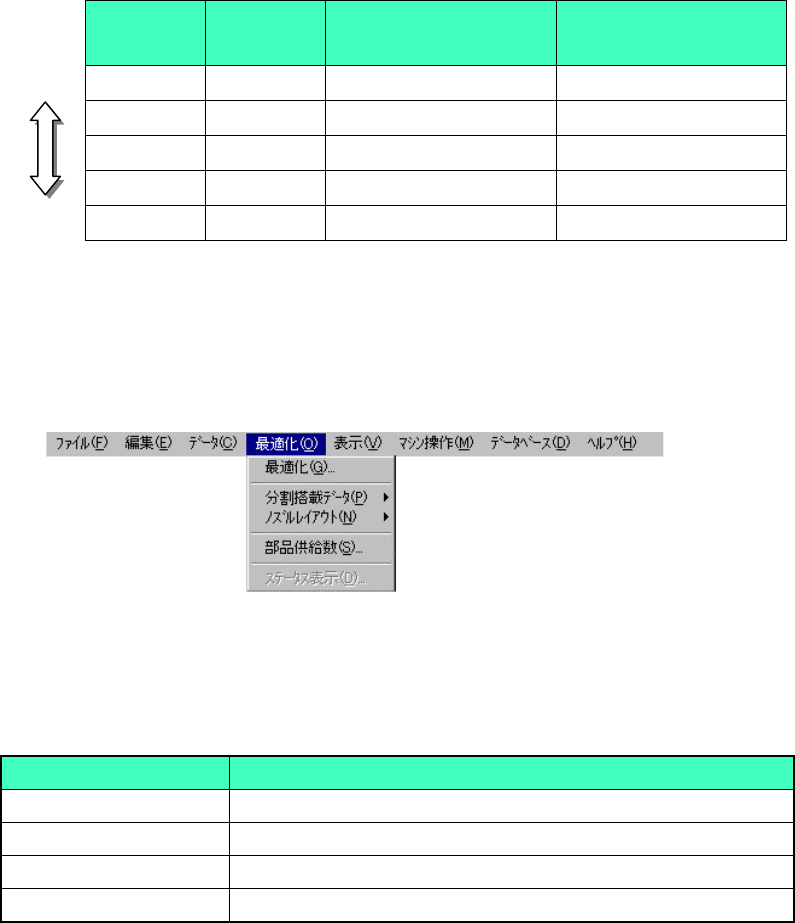 4 – 11 7 4-10-1. 最適化 最適化 最適化 最適化 最適化を実行します。 図 図 図 図 4-10-1-1 最 適 化 最適化 最適化 最適化コマンド選択例 コマンド選択例 コマンド選択例 コマンド選択例 最適化の結果は,オプション オプション オプション オプションの設定や部品供給数 部品供給数 部品供給数 部品供給数の設定により大きく変化します。オプション オプション オプション オプションお…