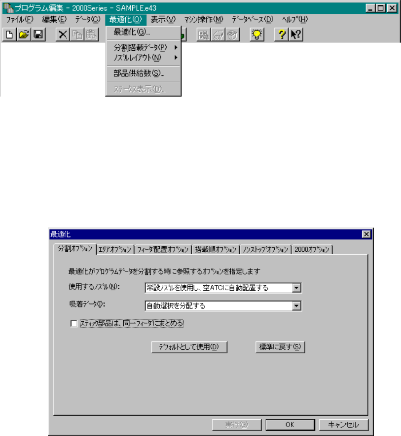 4 – 11 8 ダイアログの中は,最適化に関する諸オプションとボタンにより構成されています。 表 表 表 表 4-10-1-1 最適化オプションの種 類 最適化オプションの種 類 最適化オプションの種 類 最適化オプションの種 類 オプションの種類 用 途 分割オプション ノズルや吸着データを割 り当てる際に最適化 が参照するオプション を指 定します。 エリアオプション フィーダを配置可能なエリアを指定します。 フィ…