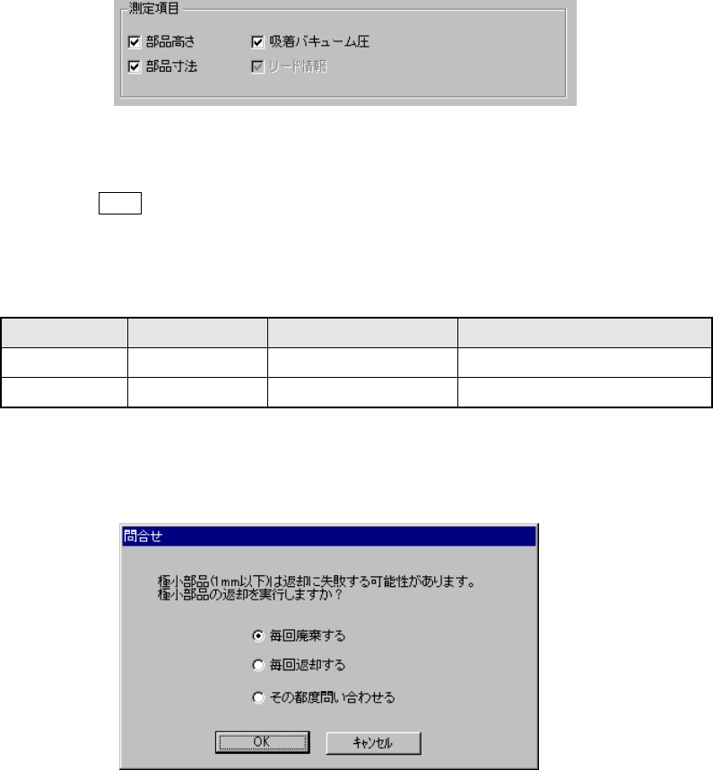 4 - 163 1) 対象とする部品 部品データの中からある条件に一致した部品だけを測定する場合に設定します。 ① 全部品 すべての部品データを測定します。 ② 薄い部品のみ 部品高さがエディットボックスに設定された以下の値の部品のみ測定します。 ③ 指定部品種別のみ コンボボックスに選ばれた部品種別のみ測定します。 ④ 指定ノズル使用部品のみ コンボボックスに選ばれたノズルを使用する部品のみ測定します。 ⑤ レーザセンタリング部品…
