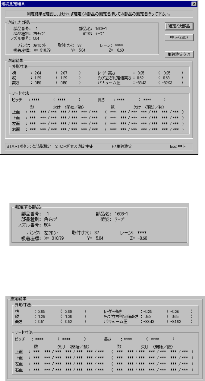 4 - 167 3) 確定/次部品(< ST ART >ボタン) 測定結果を有効にし、結果 の値を部品データに格納し ます。その後、次の部品の 測定を行 います。 4) 中止( ESC キー) 測定結果を無効にし、その 後、連続測定を中止して元 の連続測定条件設定画面に 戻ります。 5) 単独測定( F7 キー) 単独測定モードに移行します。 6) ショートカットキー 連続測定結果画面では、以下のショートカット操作を行うことができま…