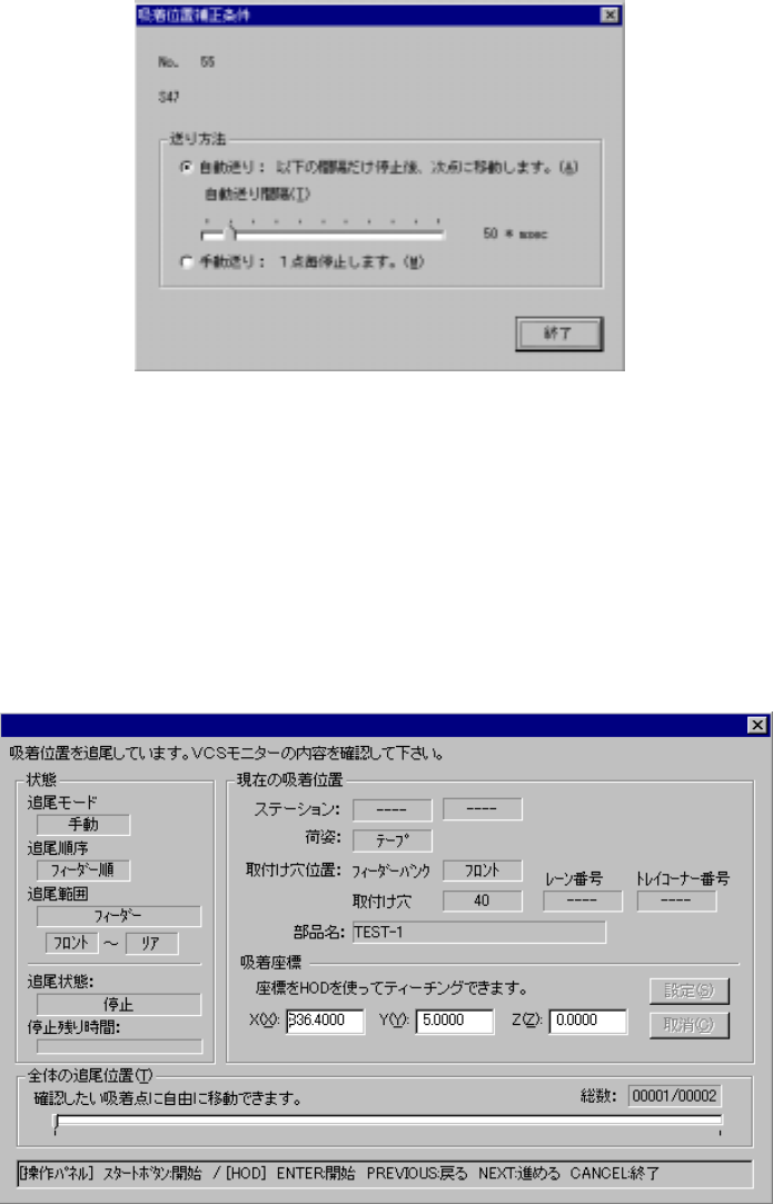 吸着位置補正条件ダイアログで<終了>ボタンを押下すると,フィーダなどの掛け替え等が行わ