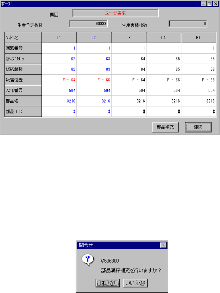 ックされていると下図のように,生産一時停止時のポーズダイアログに<部品補充>ボタンがつ