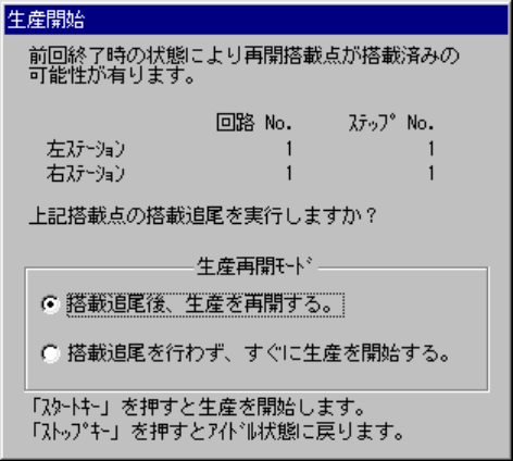 生産開始(新規生産)処理前ダイアログにて「搭載追尾後、生産を再開する」を選択した場合、