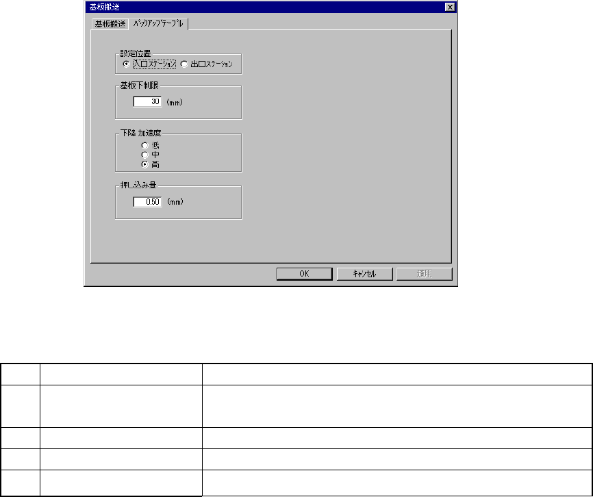 基板搬送」「バックアップテーブル」が指定できます。