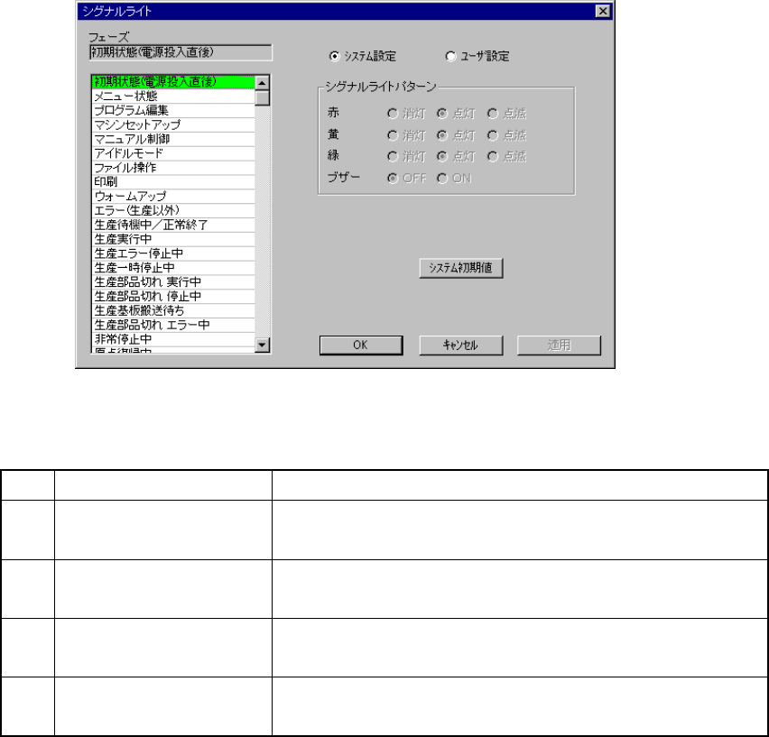 7 - 34 7-2-2-1 1. シグナルライト シグナルライト シグナルライト シグナルライト シグナルライトを選択すると,図 7-2-2-11-1 のシグナルライト設定ダイアログが表示されます。 図 図 図 図 7-2-2-1 1-1 シグナルライトの設定ダイアログ画面 シグナルライトの設定ダイアログ画面 シグナルライトの設定ダイアログ画面 シグナルライトの設定ダイアログ画面 (1) 設定項目 No. 項目 設定する内容 1 …