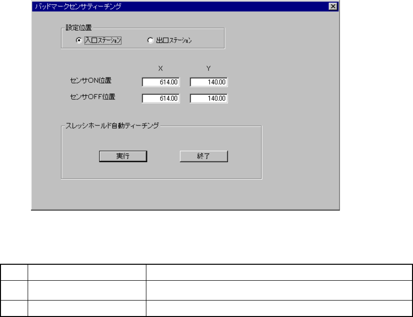 7 - 37 (3) 実行動作 ・ 実行を選択するとバッドマークセンサの「初期化中」ダイヤログが表示され,バッドマー クセンサが初期化されます。 その後, バッドマークセンサティーチングの 「実行中」 ダイヤログが表示され, ティーチン グが自動実行されます。 図 図 図 図 7-2-2-12-2 バッドマークセンサ初期化中ダイアログ画面 バッドマークセンサ初期化中ダイアログ画面 バッドマークセンサ初期化中ダイアログ画面 バッドマー…