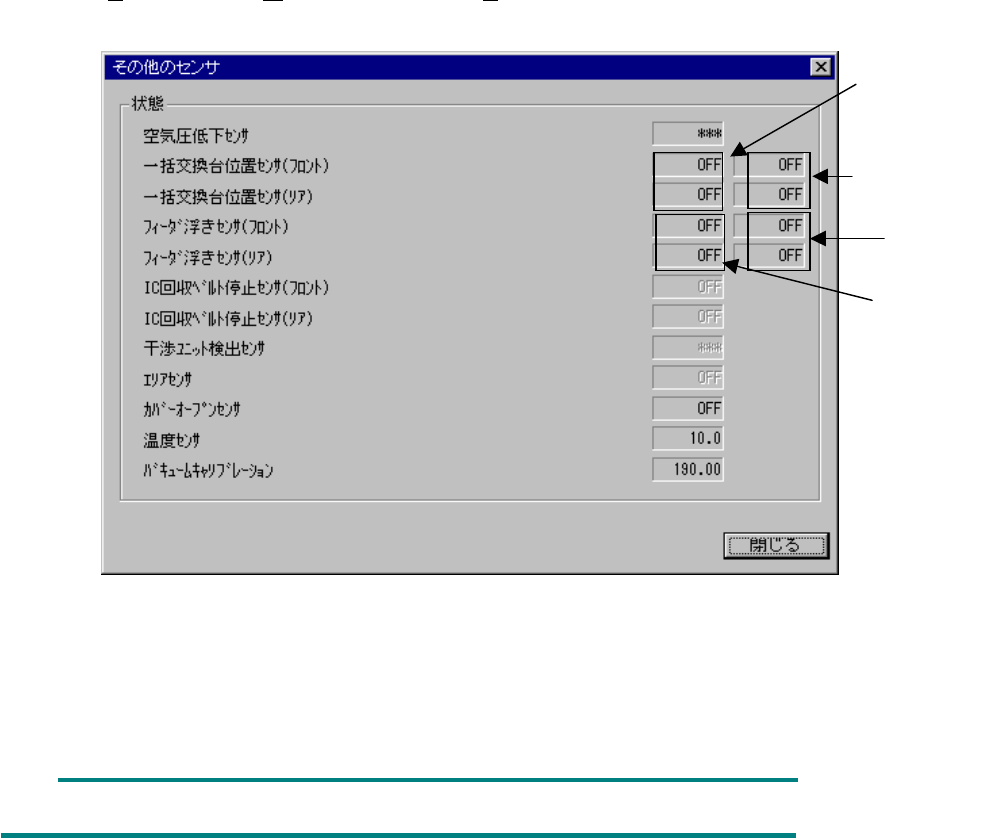 8 – 48 2) バキューム制御 バキュームの ON / OFF を制御します。 制御項目の“バキューム”がチェックされているときに< ON ( 1 )>ボタン,< OFF ( 2 )> ボタン,< ON / OFF ( 3 )>ボタンを 選択するかまたは, F3 キー, F4 キー,F5 キー, を押して制御します。 ・状態表示は、制御完了時に更新されます。 (3) 状態表示 各ユニットの状態を制御完了時に表示します。