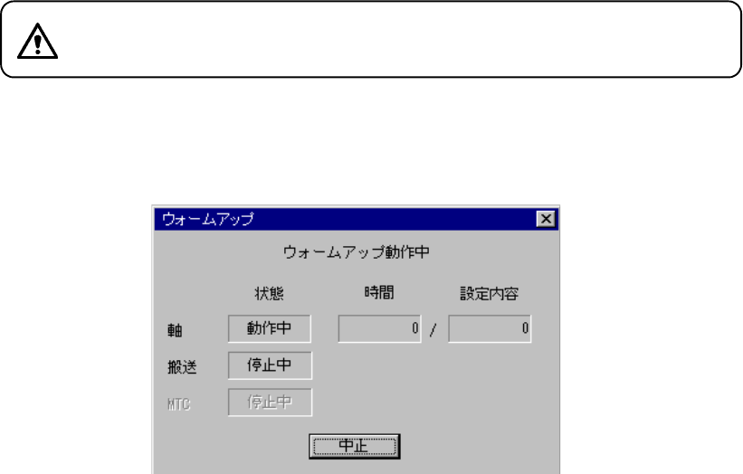 9 - 2 9-2. ウォームアップ ウォームアップ ウォームアップ ウォームアップ 9-2-1. 初期画面 初期画面 初期画面 初期画面 メイン画面のメニューバー から「メンテナンス」[ウ ォームアップ ... ]が選択さ れると,下図のウ ォームアップ初期画面が表示されます。 図 図 図 図 9-2- 2-1 初期画面 初期画面 初期画面 初期画面 < START >スイッチを押すと,ウォームアップ動作を開始します。 9…