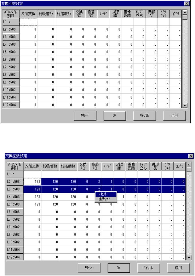 ノズル毎交換回数設定ダイアログではリセットしたいデータをキーボードやマウスで選択し,右ク