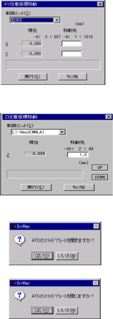 「 手動方式 」 : XY 移動ボタン、Z 移動ボタン、ATC 開ボタン、ATC 閉ボタンを操作し、