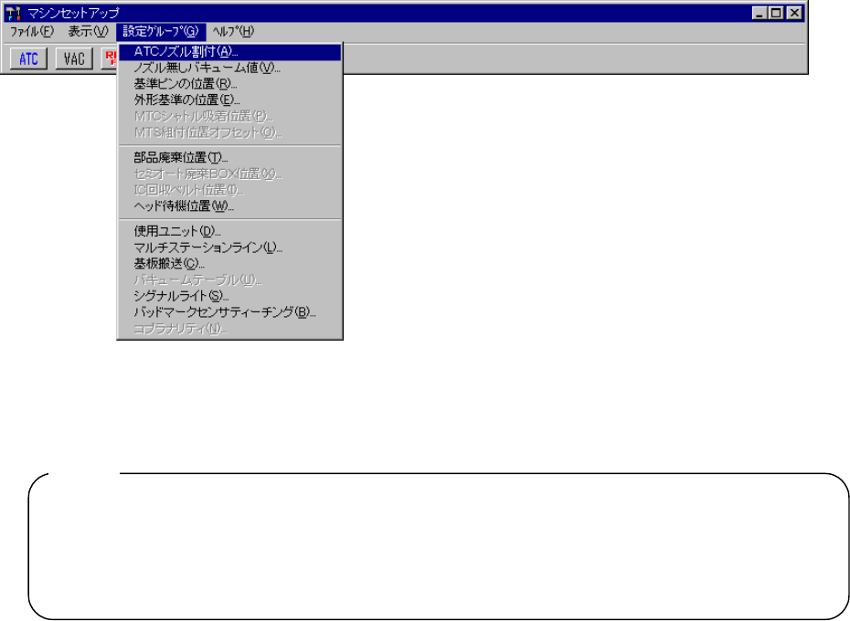 7 - 13 7-2-2. 設定グループ 設定グループ 設定グループ 設定グループ メニューバーより[設定グループ]を選択すると図 7- 2-2-1 に示すコマンドが表示されます。 図 図 図 図 7-2- 2-1 設定グループの項目 設定グループの項目 設定グループの項目 設定グループの項目 1) グレーアウト部分は選択できません。 (但し、表示されるコマンドは機種により異なります。 ) 2) 設定時にメカを駆動する必要がある場合…