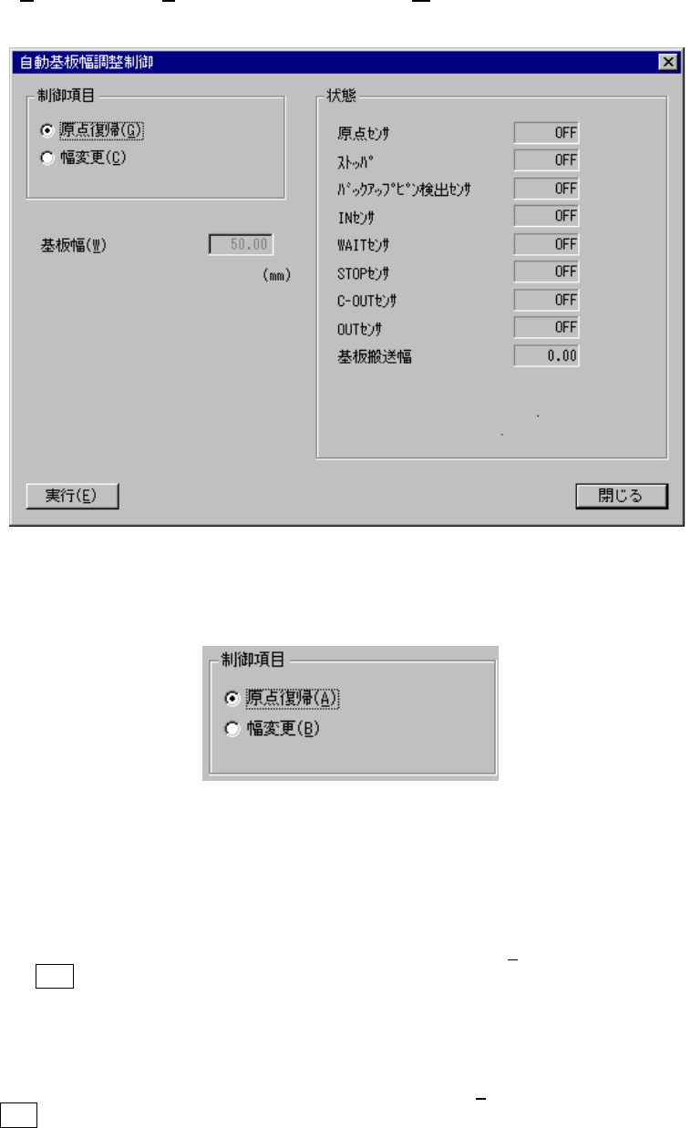 8 - 31 8-3-3. 自動基板幅調整制御 自動基板幅調整制御 自動基板幅調整制御 自動基板幅調整制御 [制御( C )][搬送系( C )][自 動基板幅調整制御( W ) ... ]を選択すると,下記の自動基板幅 調整制御のダイアログが表示されます。 図 図 図 図 8-3-3 自動基板幅調整制御ダイアログ 自動基板幅調整制御ダイアログ 自動基板幅調整制御ダイアログ 自動基板幅調整制御ダイアログ (1) 制御項目 制御項目を…