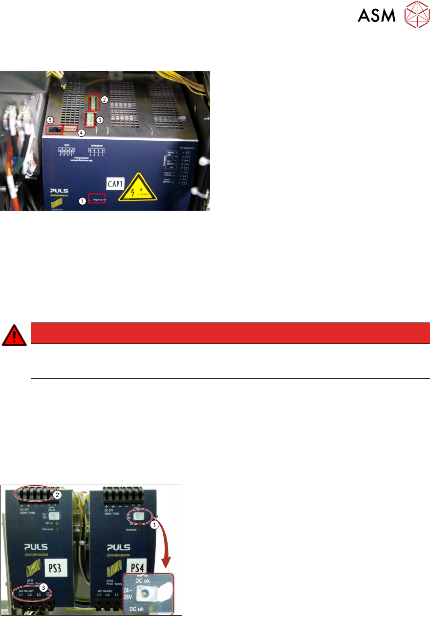 7 电源 7.6 SMPS TX 各单元的功能描述 104 技术培训 FSE SIPLACE TX系列 01/2018 7.6.2.1 电源(SMPS)– 安全指示 PS1 上灯指示 ● LED 绿色 300VDC 至 220VDC ● LED 红色 220VDC 至 5VDC ● LED 熄灭 低于 5VDC 警告 只有当电压降至低于 5VDC(两个 LED 灯熄灭)时,才能操作电源装置,否则可能会发生危 险! CAP1 上灯指示 ●…