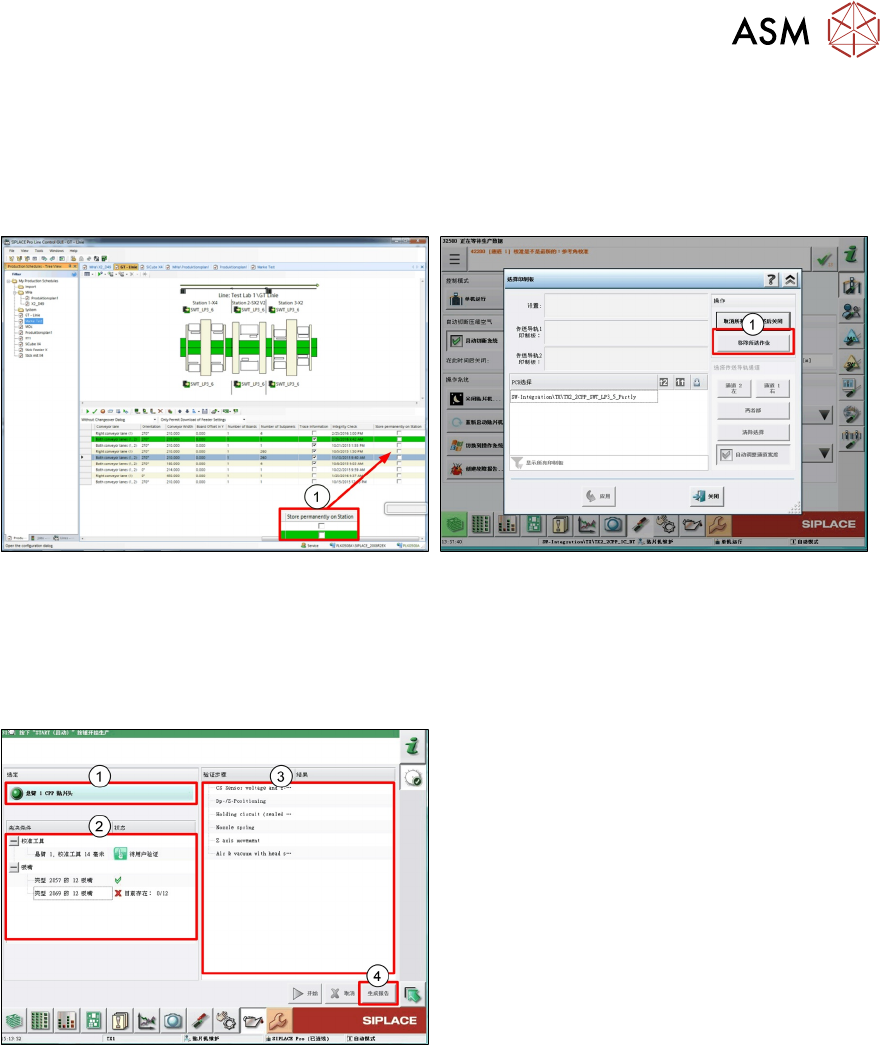 9 贴片机软件概览 9.7 维护界面 技术培训 FSE SIPLACE TX系列 01/2018 149 验证 — 贴片机验证 贴片机验证功能通过常规 ACT 工具生成报告,以检验贴片机的准确度。 除当前功能外,贴片程序还能在 SIPLACE Pro 中标记为“永久”。只要硬件配置没有更改,ACT 程序 即始终在可用贴片机中。可从贴片机中删除该永久性贴片程序。 1. 在 SIPLACE Pro 中标记为“永久” 2. 删除贴片机上的程序…