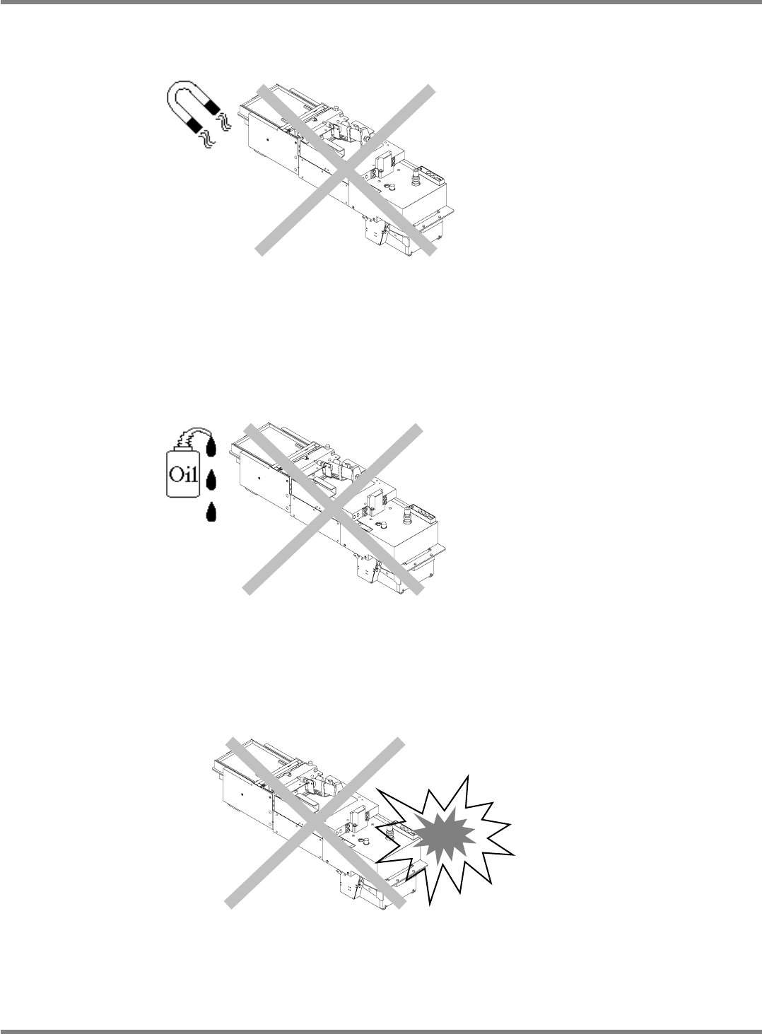 NPM X / NPM 安全注意事项 Page S-8 MFTUXC-SF-02N -14 不要放置于靠近磁场的地方。 如果吸着部的周边被磁化,有的芯片 可能容易导致破损。 请勿保管于使用油及有机溶剂的场所。 有可能导致橡胶和树脂零件劣化及破 损。 请勿撞击或脱落。 即使表面上没有损伤,也有可能导致 动作的不稳定性。在使用振动部 时,请特别注意。
