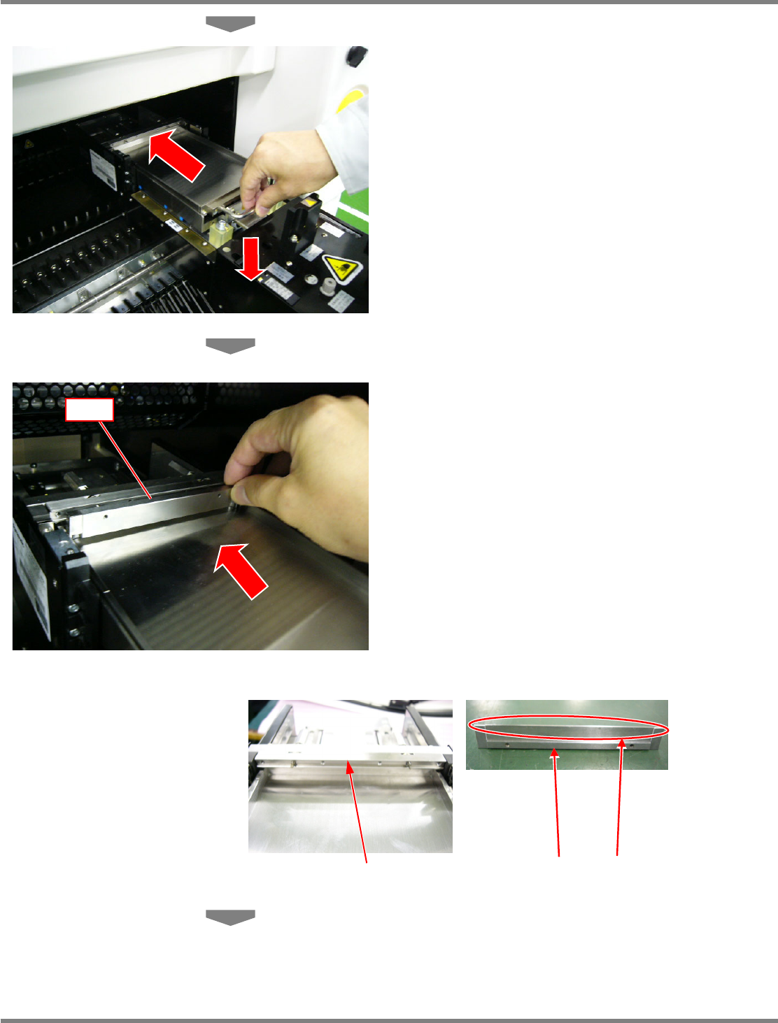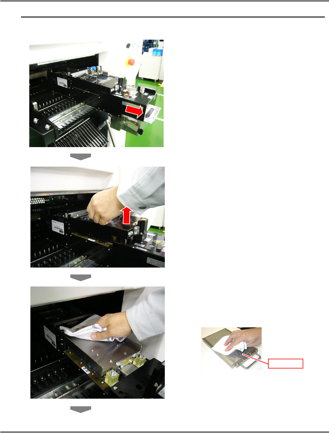 NPM X / NPM 通用型转印装置 2.2 转印台、刮刀装置以及刮板的安装 Page 2-8 MFTU-EJM9BC-MB-02N-19 4 安装转印台。 5 将转印台的手柄向下方压下。 6 安装刮板 。 此时,确认刮板安装面、以及刮板背 面是否有 污垢和异物,如果有,请进行清扫。 请注意刮板的角不要撞到转印台。另 外,在使 用刮板时,请注意不要将物体撞到成 膜部。若 成膜部受到损伤,则有可能无法安定 地成膜。 MFTU-N…