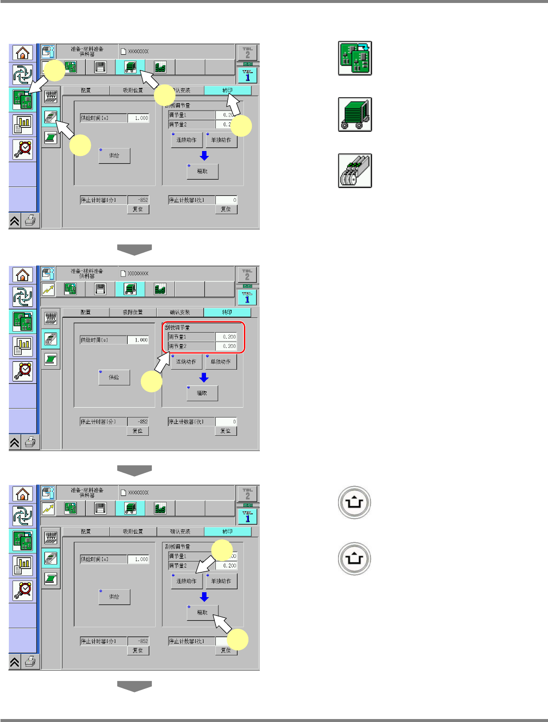 NPM X / NPM 通用型转印装置 4.1 转印材料的初始供给方法与成膜确认 Page 4-10 MFTU-EJM9BC-MB-04N-17 4.1.2 成膜的确认 1 按下 。 2 按下 。 3 按下 。 4 按下 [ 转印 ] 。 5 输入用于生产的膜的最大厚度。 请在刮板调节量 1 和刮板调节量 2 栏中用数字 键输入同一数值。 6 按下 + [ 骚取 ] 。 7 按下 + [ 连续动作 ] 。 会反复执行成膜、骚取的动作…