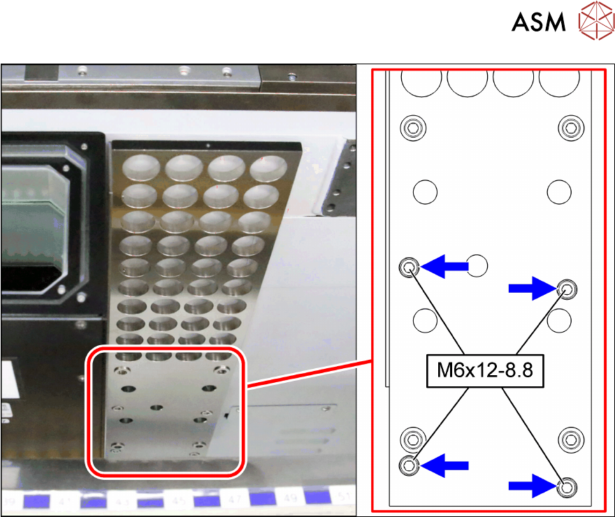 ► Mount the support plate complete [03112717‑xx] onto the machine frame as shown with four