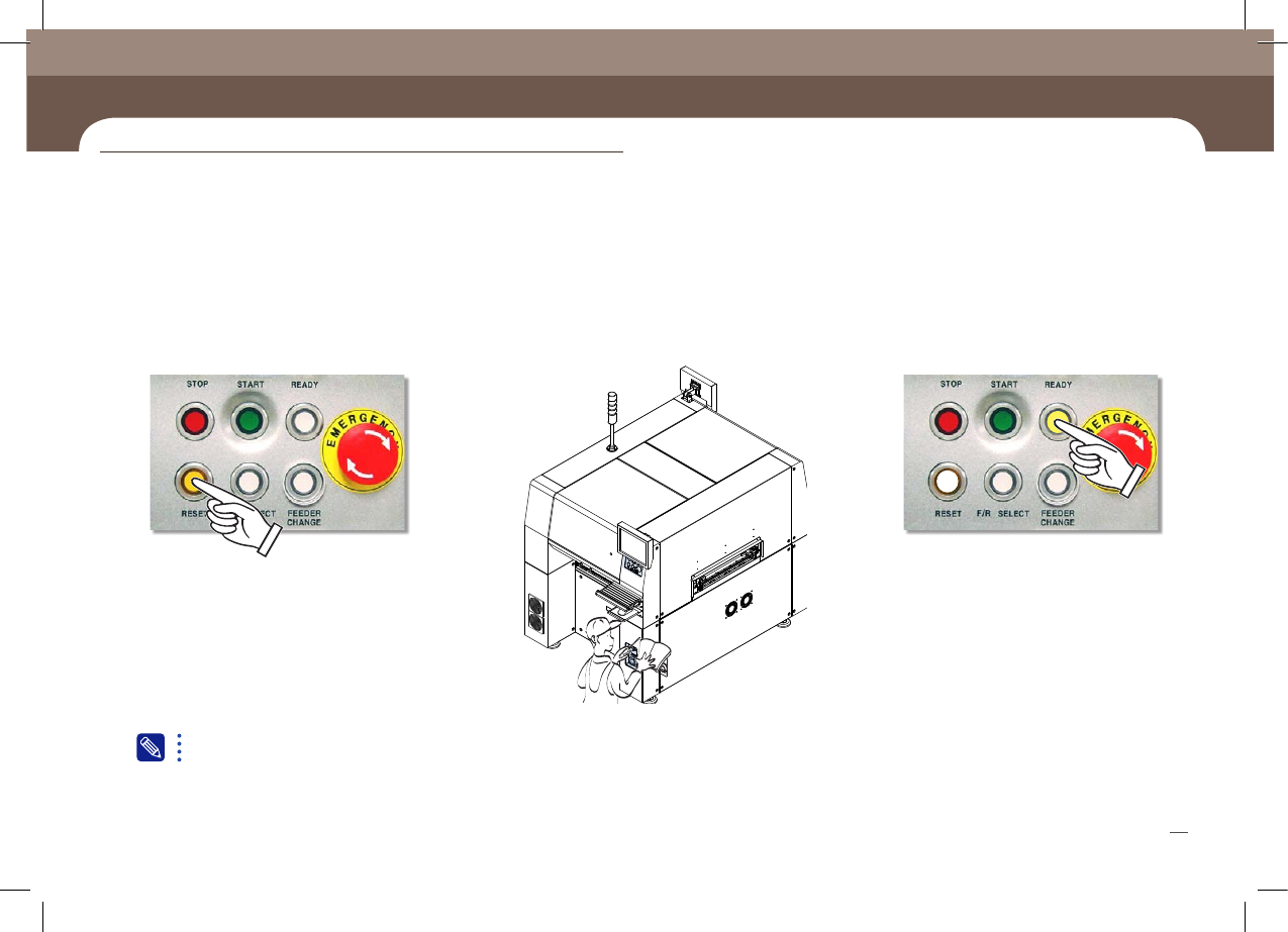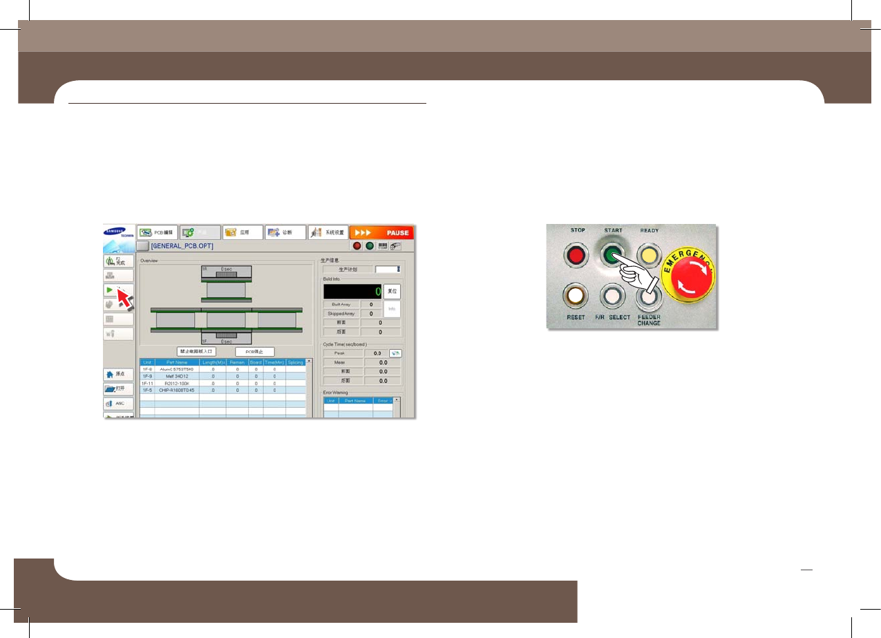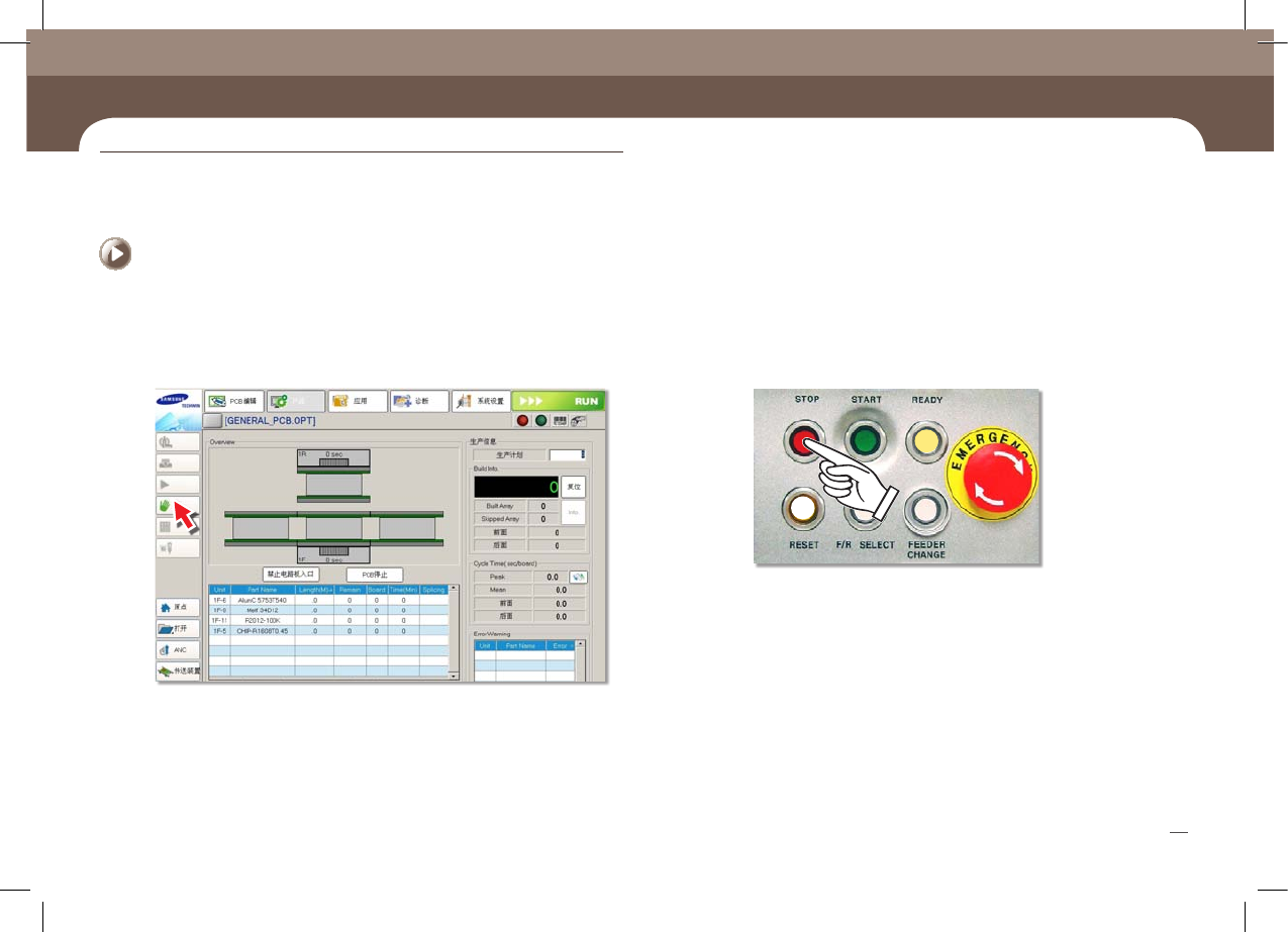 Chapte r 4 紧急 停止 方法 SM431 Operation Handbook 37 Chap ter 4 Fast & Flexible Chip Shooter - 针对必要事项进行检查并采取相应措施后 , 选择 ' 开始 ' 子菜单。 - 按 <ST ART> 按钮恢复生产。 紧 急 停 机 方 法 本部 分主 要介 绍检验 生产 中错 误或其 他事 项并 采取 措施 时的设 备暂…