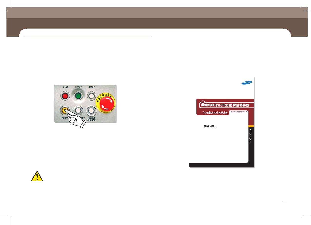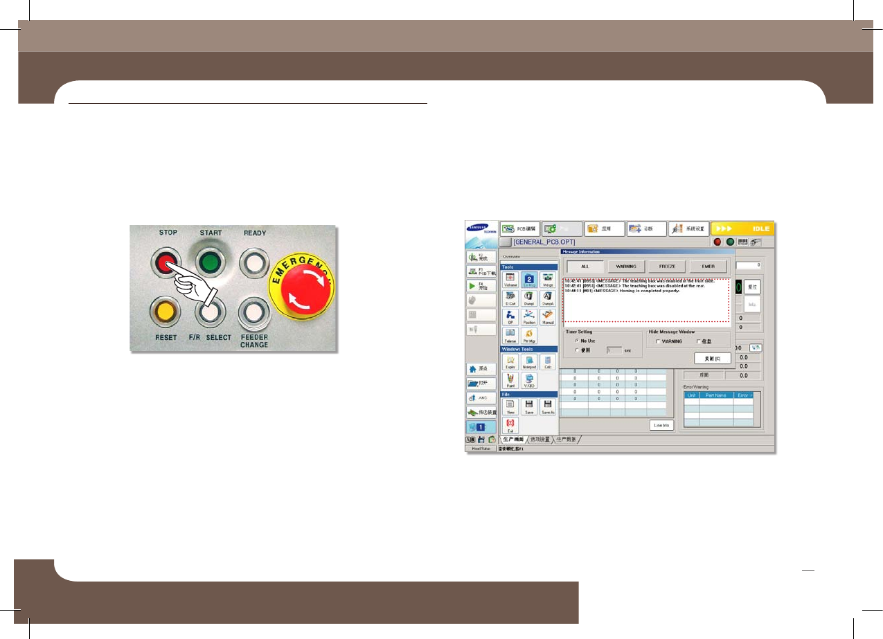 SM431 Operation Handbook 44 Chap ter 4 Fast & Flexible Chip Shooter 紧 急 停 机 方 法 本部 分主 要介 绍检验 生产 中错 误或其 他事 项并 采取 措施 时的设 备暂 停方 法( 继续 /开始 模式 ), 异常 停 止方 法( 人为 /系统 异常 停止 ), 异常 停止 后系 统重 启方法 等。 2 . 系 统 紧 急 停 止 : 系 统本 身 判 断 …