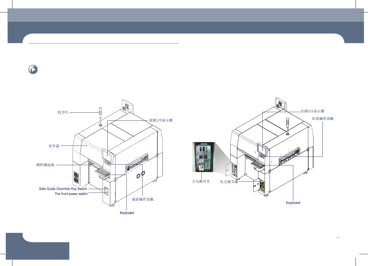 Chapte r 1 设备 概要 SM431 Operation Handbook 7 Chap ter 1 Fast & Flexible Chip Shooter 设备概要 本部 分介 绍设 备、操 作面 板及 MMI (M an -M ac hin e I nt er fac e) 。 1 . 设 备 正 面 2 . 设 备 背 面 设 备各 部 位的 名 称
