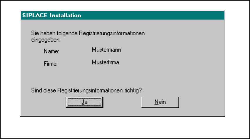 SIPLACE S oftwareanleitung SR.503.xx 9 Softwareinstallation Ausgabe 12/01 DE 9.2 Installation der Stationssoftware 503.xx 109 9.2.4 Registrierungsbestätigung In dieser Mas ke könne n Sie ihre Angabe n nochmals üb erprüfe…