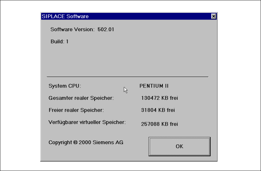 SIPLACE S oftwareanleitung SR.503.xx 6 Online - Hilfesystem Ausgabe 12/01 DE 6.1 Allgemeines 81 6.1.1.5 Allgemeine Informa tionen zum S t ationsrechn er aufrufen Klick en Sie i m Menü Hilfe di e Menüopt ion Info... an.…
