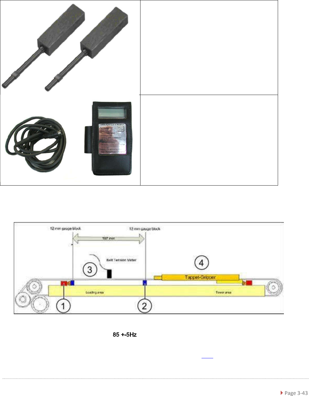 Service Ma nual W PC5 / WPC6 3.5.6 Setting the Load Axis Belt Tension Tools Required Measurement setu p - measuring the belt tension for th e load axis ➢ Push the tw o setting gauges (1 and 2) under the tooth ed belt, at…