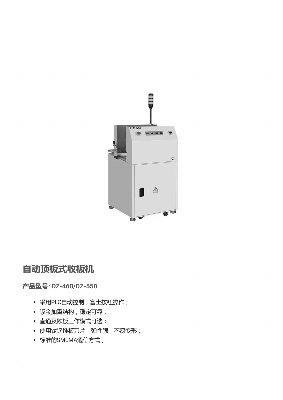 自动 顶板式 收板机 产品 型号: DZ-460/DZ-550 • 采用 PLC 自 动控制 , 富 士按钮 操作; • 银金加 重结构 , 稳 定可靠 ; • 直通及 跌板工 作模式 可选;  使用 钛钢推 板刀片 , 弹性强 , 不 易变形 ; • 标准的 SMEMA 通信 方式;