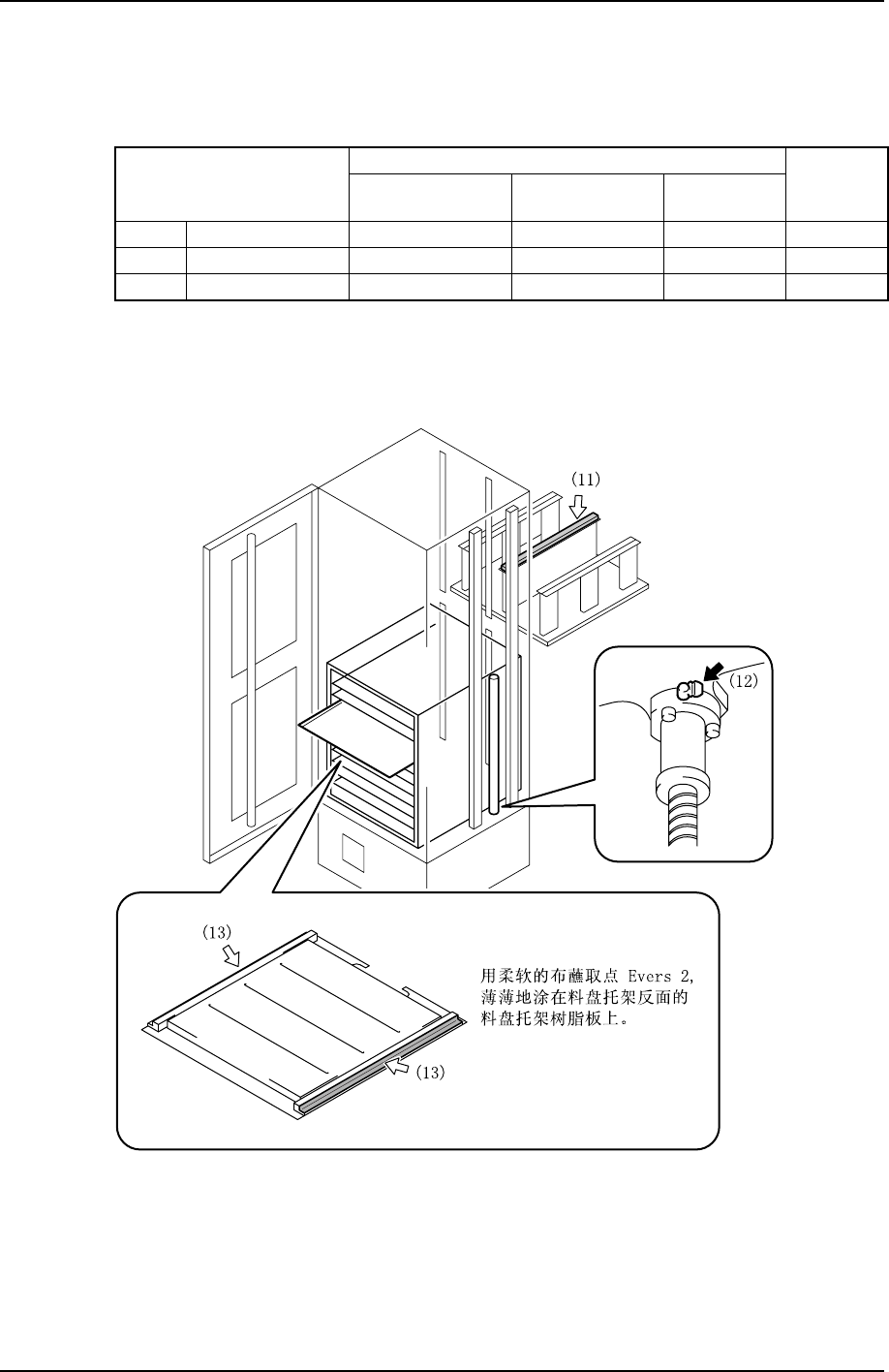 第 2 章 注 油 第 3 部 XP-242E 机械手册 3-2-8 Edition 1.0 2.5 料盘 单 元的注 油 处 润滑油 的 种类 注 油 处 DAPHNE EPONEX No.2 BIRAL T&D EVERS · 2 注 油 周期 12 LM 轨道 × ○ × 6 个月 13 滚珠 丝杠 ○× × 3 个月 14 料盘 托架树脂 板 ×× ○ 3 个月 ○∶ 注 油 ×∶禁 止注 油 T007S 插图 内的 箭…