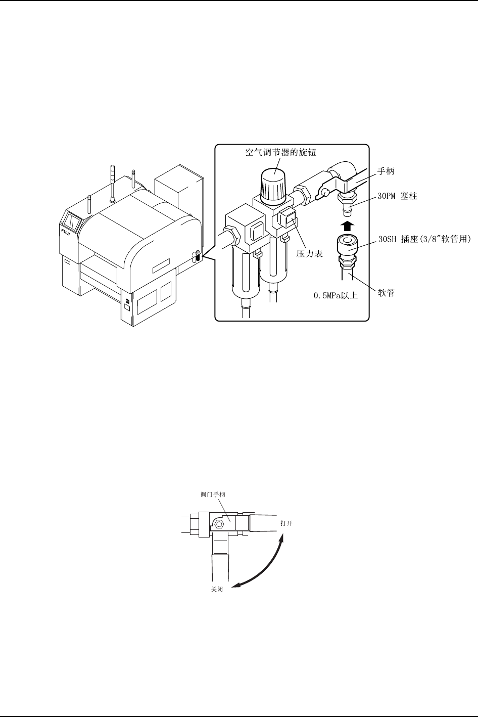 把外部压缩空气供应管接到主机上,并用调节器调整到规定的空气压力(0.5MPa)。