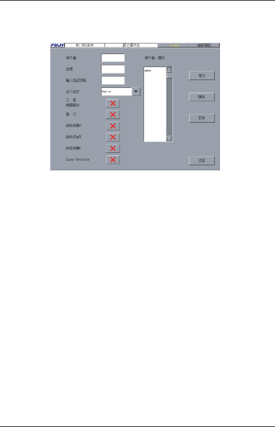 機器啟動時增加的操作者名會顯示在操作者清單中。有關操作者的客戶化請參閱以下章