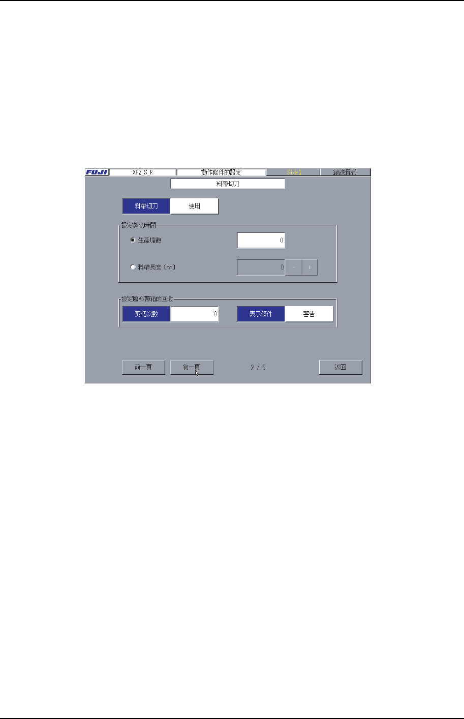 2. 選擇[後一頁]按鍵,顯示料帶切刀畫面。