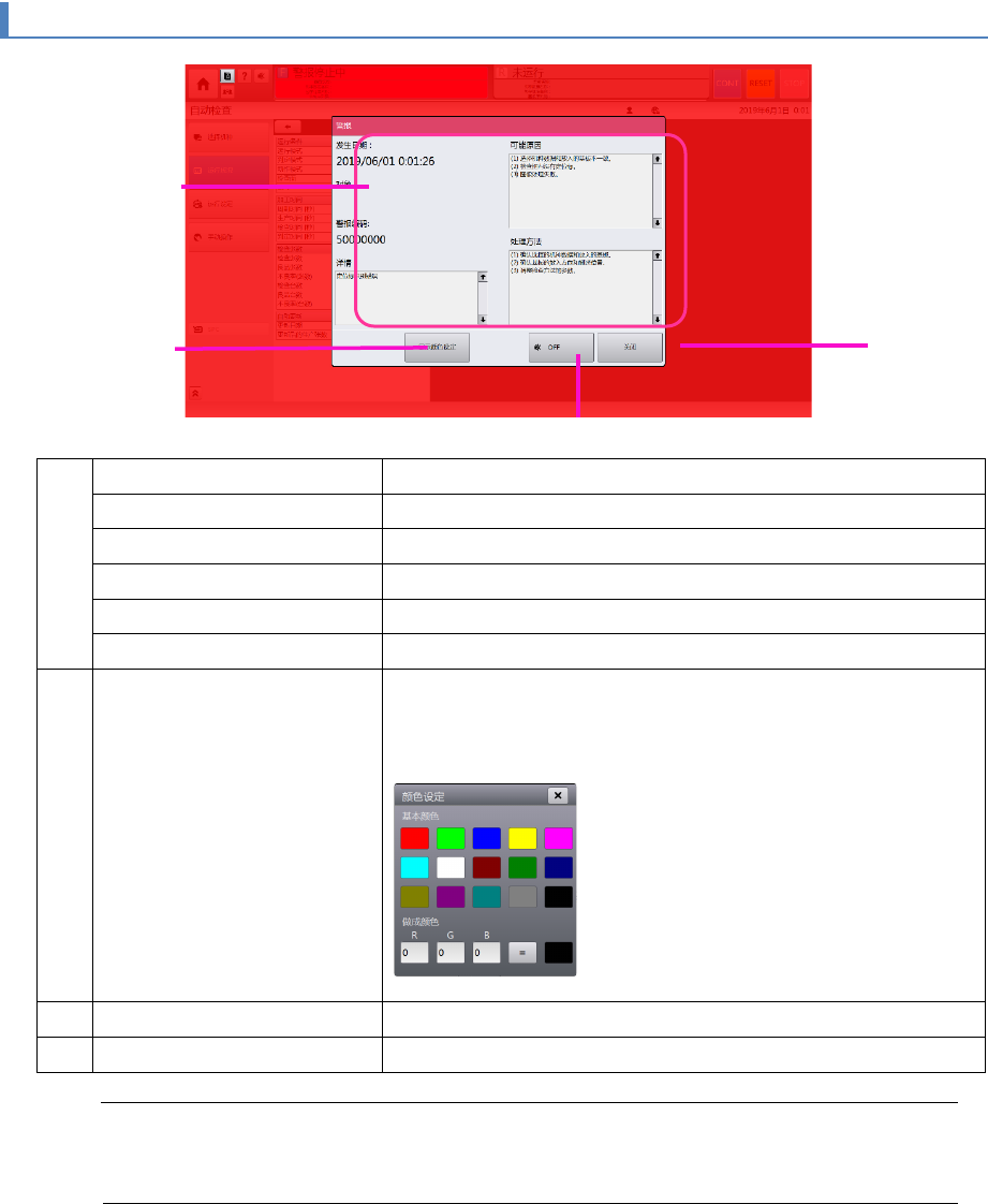第 4 章 操作 篇 4- 3. 自动运转 的步骤 26 4-3- 8. 警报显示 (a) 发生日期时间: 显示警 报发 生的日期。 对象 : 显示警 报发 生的轨道。 警报代码 : 显示警报代码。 详细: 显示警报的详细信息( 错误消息)。 可能原因 显示推定原因。 处理方法 显示应对方法。 (b) 设定显示颜色 变更显示警报时的背景 色。 可以选择的颜色为 [ 基本 颜色 ](15 种颜色 ) ,或者 [ 做成颜色 ]( 输 入 R…