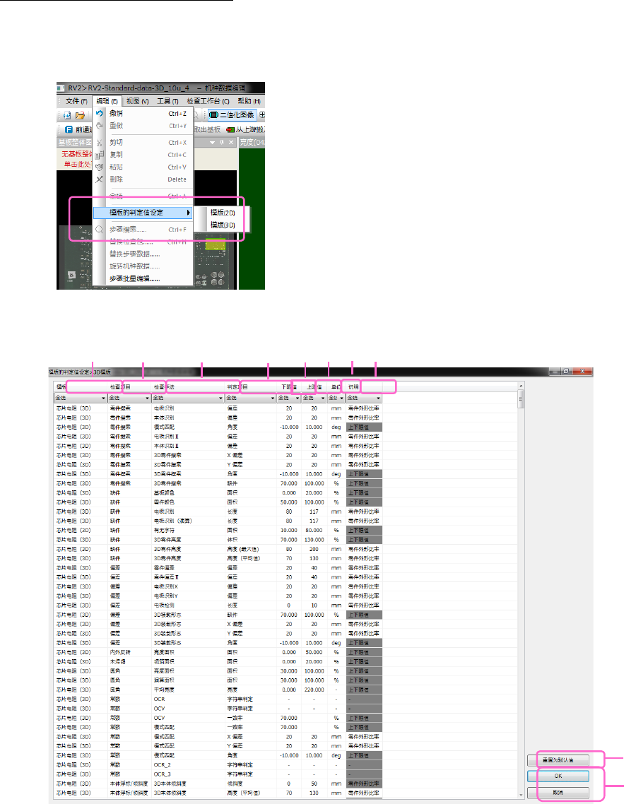 从数据编辑菜单选择[编辑] - [模板的判定值设定] - [模板 2D]或[模板 3D]。