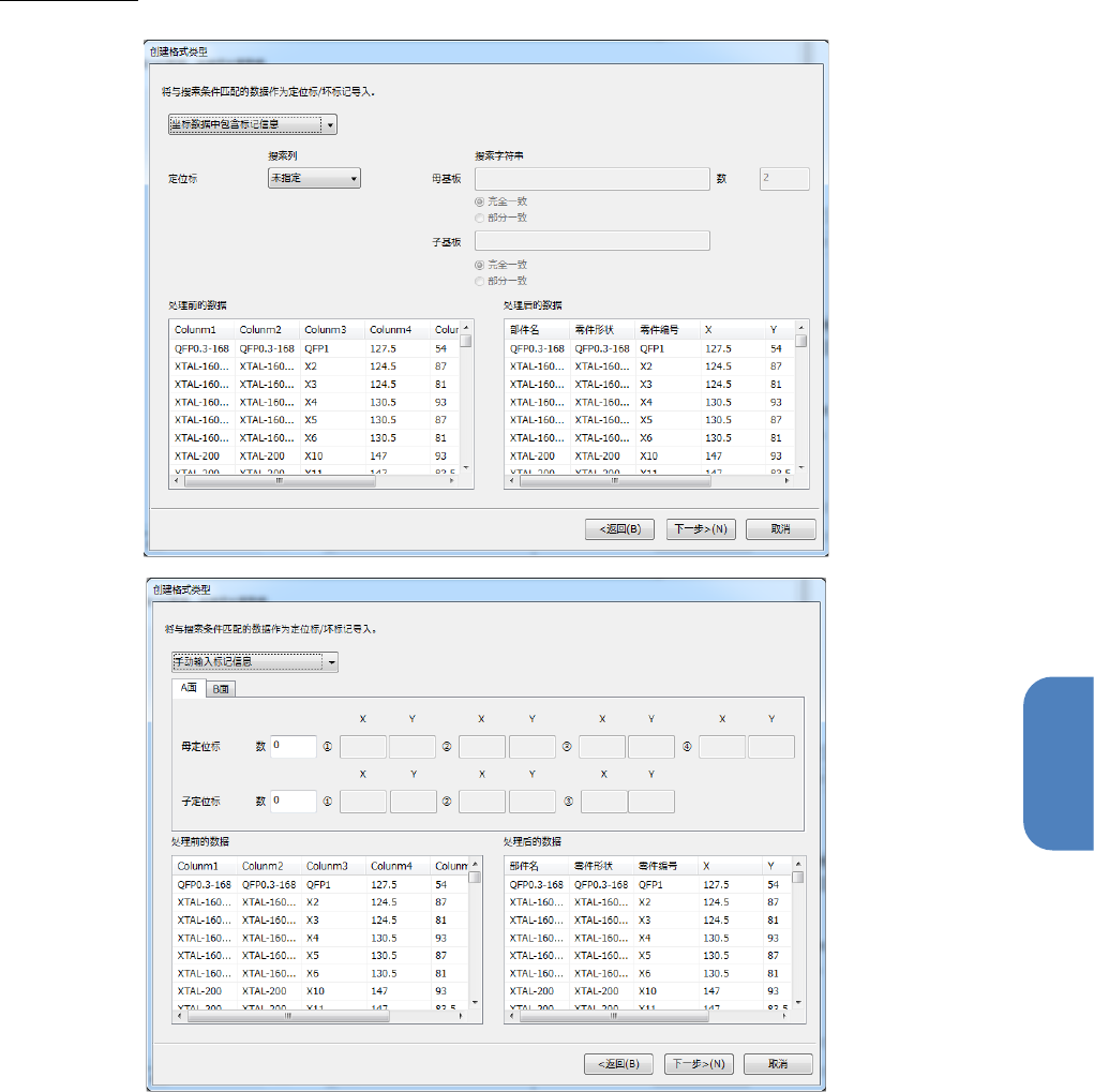 第 4 章 操作 篇 4- 5. 机型数据 的创建和编辑 63 4 7. 指定 定位标 可以设置导入的标记 信息 。 在选择了「坐标数据中 包含标记信息」时, 在处理前的数据中 指定 定位标的 信息 。 指定了定位标所保存的 列之后,可以指定母 基板和子基板的搜索 字符串、母 基板 的数量。 通过指定单选按钮,可 以选择是对 搜索 字符串采用完全 一致的搜索,还是部分 一致的搜索。 在「处理前的数据」处 显示前页处理的 CA D 数据 …