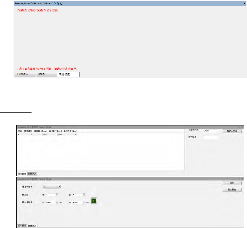 第 4 章 操作 篇 4- 5. 机型数据的 创建和编辑 86 在亲基板的 [ 零件标记 ] 页勾选 [ 全部子基板的设定 相同 ] 时,子基板的 [ 零件标记 ] 处不能设定零件标 记。 子基板的零件标记应随 着亲基板进行设定。 未勾选 [ 全部子基板的设定相 同 ] 时 ,在 子基板的 [ 零件标记 ] 处可以设定子基板 的零件标记。 子板的 编辑 子板的 编辑 画面在勾选了机型数据信 息的[集合基板] 时,显示如下操作。 导 …