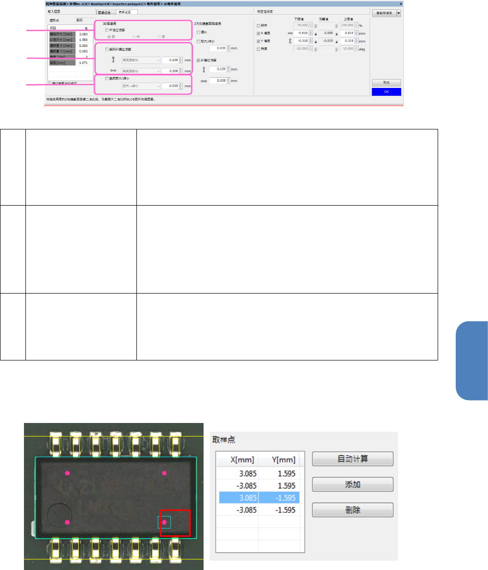 第 4 章 操作 篇 4- 5. 机型数据 的创建和编辑 125 4 (g) 中值过滤器 中值过滤器勾选 ON ,则实施检查对象 3D 图像的中值过滤器处 理。 通过切换级别(弱、中 、强),可以调节过 滤器处理的强弱。 弱: 3 × 3 像素范围的过滤 器处理 中: 5 × 5 像素范围的过滤 器处理 强: 7 × 7 像素范围的过 滤器处理 (h) 黑白纵横过滤器 黑白纵横过滤器勾选 ON ,则对检查对象 3D 图像,在指定尺寸 […