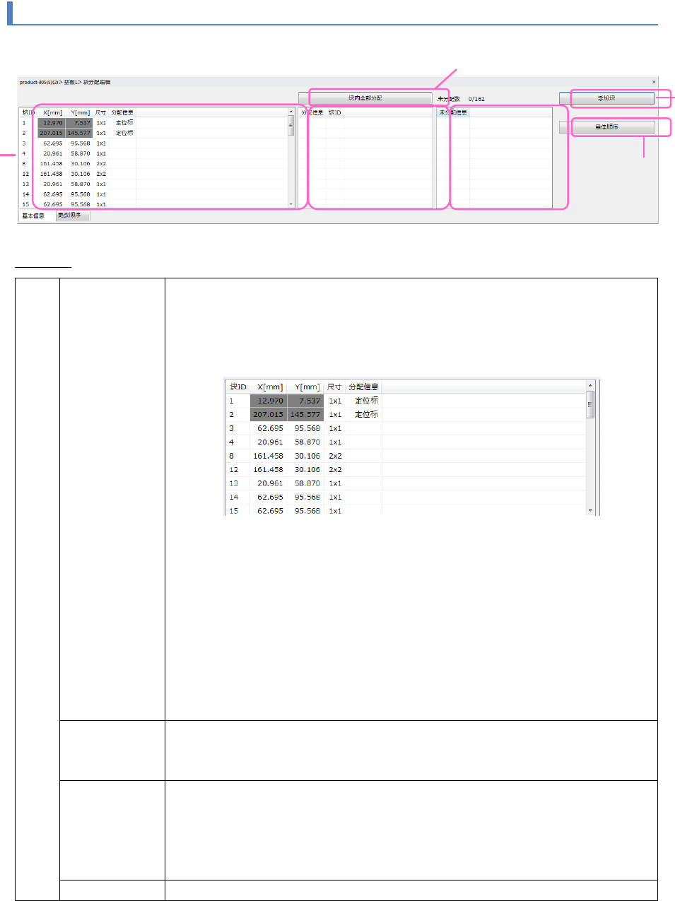 第 4 章 操作 篇 4- 5. 机型数据 的创建和编辑 168 4-5- 23. 块分配编辑 可手动调整块分配位置 、块分配顺序及块 添加 ・ 删除 。 基板信息 (a) 块信息列表 ・ 用 列表 显示全部块 信息。 ・ 根据选择,更新 分配 信息列表。 ・ 默认排序顺序为块 编号升序。 ・ 在选择 块 上 点击鼠 标 右 键打开内容菜单,选择该菜 单的 「 删除 」 即可删 除块。 ・ 如果 删除 的块中存在大元件,与 该大元件关联…