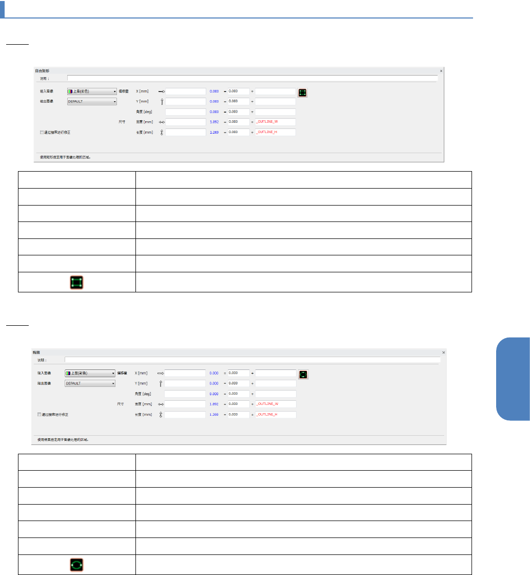 第 4 章 操作 篇 4- 6. 进程模式 185 4 4-6- 9. 检查进程的 详细设 定 矩形 设定一块作为图像处理 的区域。 说明 可输入注释。 输入图像 指定输入源的图像型本 地内存。 输出图像 指定输出目标的图像型 本地内存。 偏移量(补正值) 指定检查框的中心坐标 。 大小 指定检查框的尺寸。 通过零件搜索进行修正 设定是否对检查框的位 置进行补正。 可在放大显示区域用鼠 标 操作 创建 检查 框。 椭圆 设定一块椭圆图形…