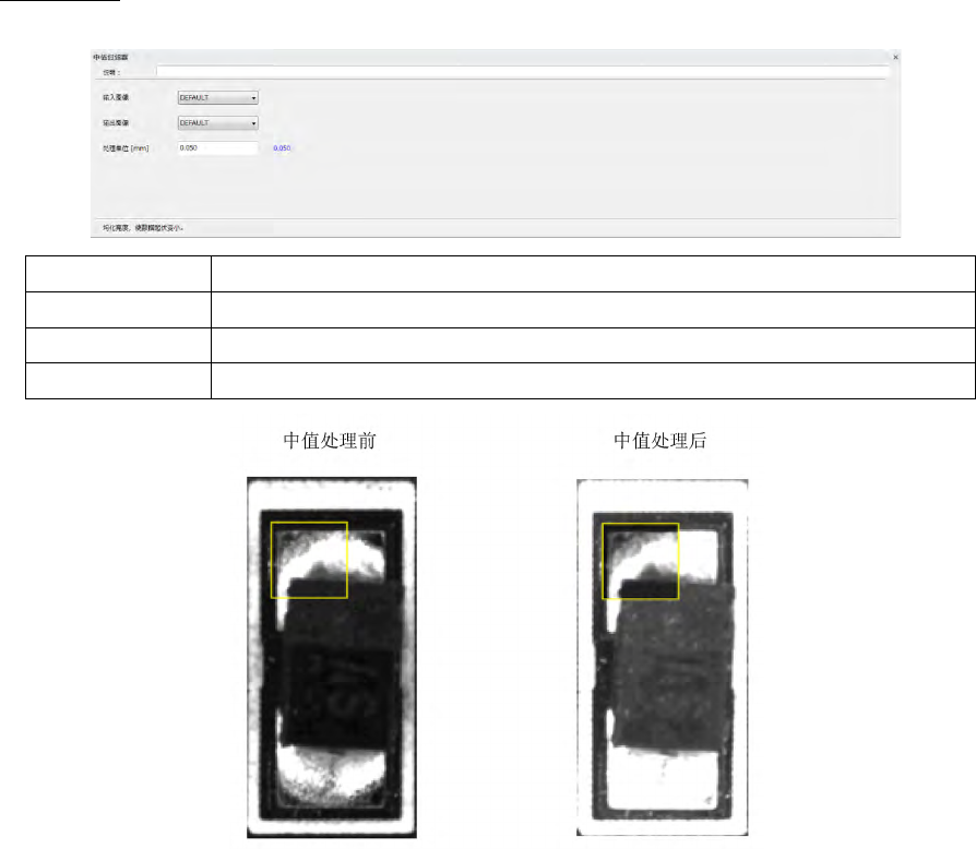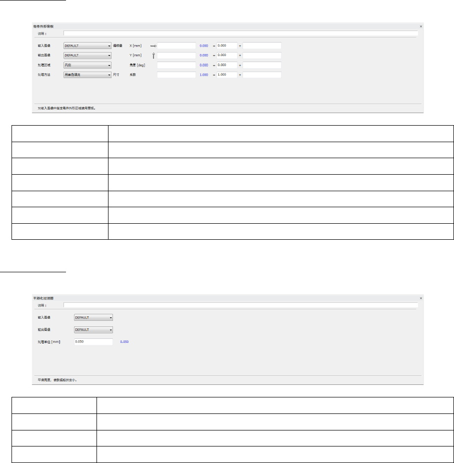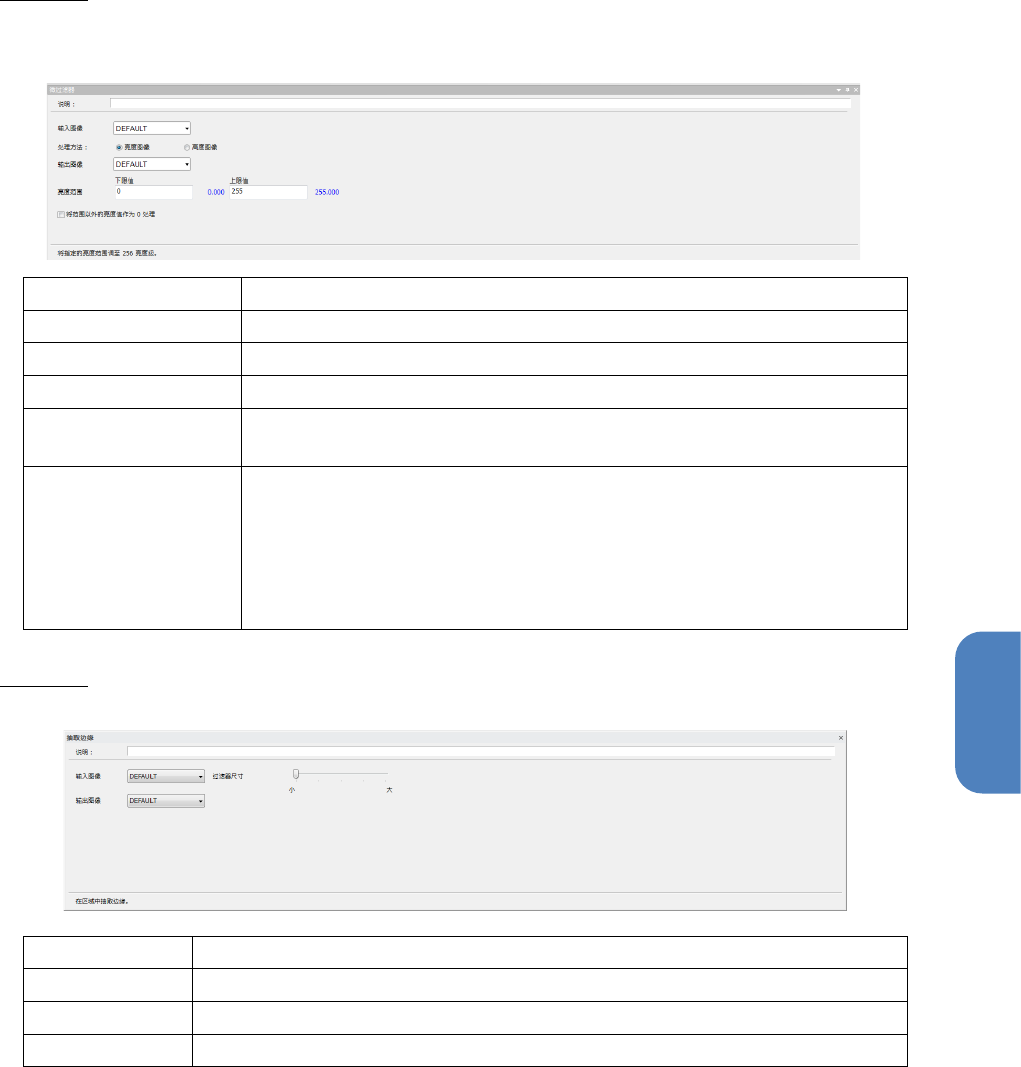 第 4 章 操作 篇 4- 6. 进程模式 195 4 微过滤波 将指定的亮度范围调 整到 256 阶段。 指定的高度范围和色调 到最小到最大值的阶 段。 说明 可输入注释。 输入图像 指定输入源的图像型本 地内存。 处理方法 从 [ 亮度图像 ] · [ 高度图像 ] 选择。 输出图像 指定输出目标的图像型 本地内存。 亮度范围 指定过滤器亮度 ( 高度 ) 的下限值,上限值 。可 输 入数 值或从本地内存中 指 定。 将范围以外的亮…