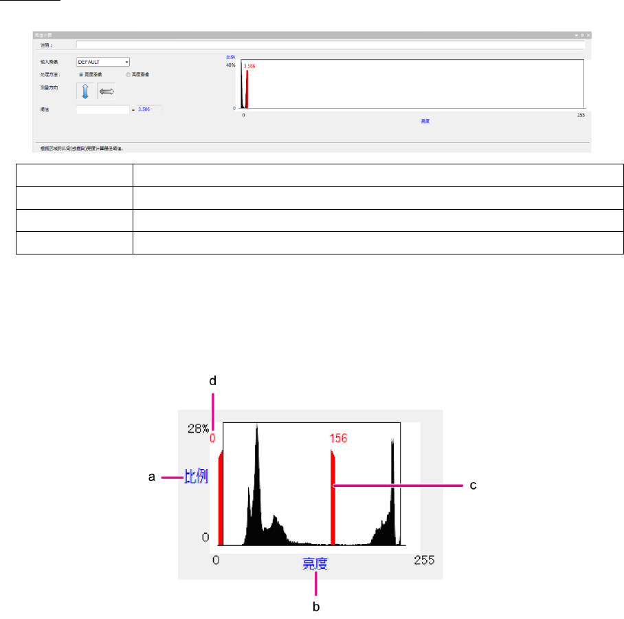 第 4 章 操作 篇 4- 6. 进程模式 203 4 单色 2 值化 对于单色图像,用亮度 ( 高度 ) 对指定区域进行 2 值 化。 说明 可输入注释。 输入图像 指定输入源的图像型本 地内存。 处理方法 从 [ 亮度图像 ] · [ 高度图像 ] 选择。 输出图像 指定输出目标的图像型 本地内存。 阈值 将计算得到的 阈值 保存到本地内存中 。 亮度 ( 高度 ) 直方 图: 利用输入图像和检查 框信息, 显示直方图 。以 红色线…