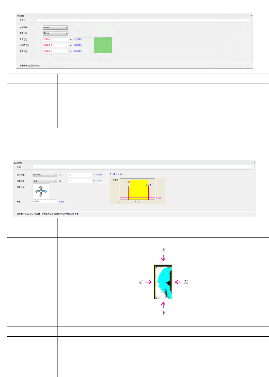 第 4 章 操作 篇 4- 6. 进程模式 206 HSV 测量 对于彩色图像,测量区 域内的 HSV 。 说明 可输入注释。 输入图像 指定输入源的图像型本 地内存。 测量方法 在[平均值],[众数 ]中指定 HSV 的测量方法。 色相 (H) 饱和度 (S) 明度 (V) 将测量结果的 HS V 各值保存到本地 内存中。 长度测量 根据指定的测量方向, 对 最初 发现的 2 值化区域,以及 到输入图像中心的距 离进 行测量。 说明 …