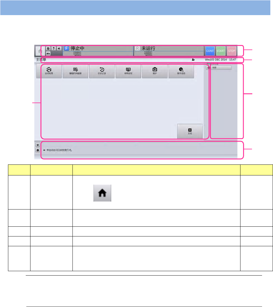第 4 章 操作 篇 4- 2. 操作画面 构成 4 4- 2. 操作画面构成 本机启动后,显示主 画面 的[主菜单 ]画面。 购买时的显示语言设定 为英语。语言的切换 步骤请参阅 “ 4-2- 1. 共用面板”的“显 示语言的切换 ”。 记号 名称 说明 参考章 节 (a) 共用面板 该面板始终显示在所有 画面的上方。 设置了 , START , STO P 等按 钮,显示当前状态,机型 名称等。 4-2-1 (b) 标题栏 显示当前…