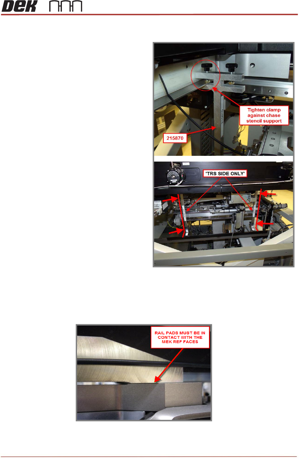 Check that the front and rear rail pads are in contact with MEK base.