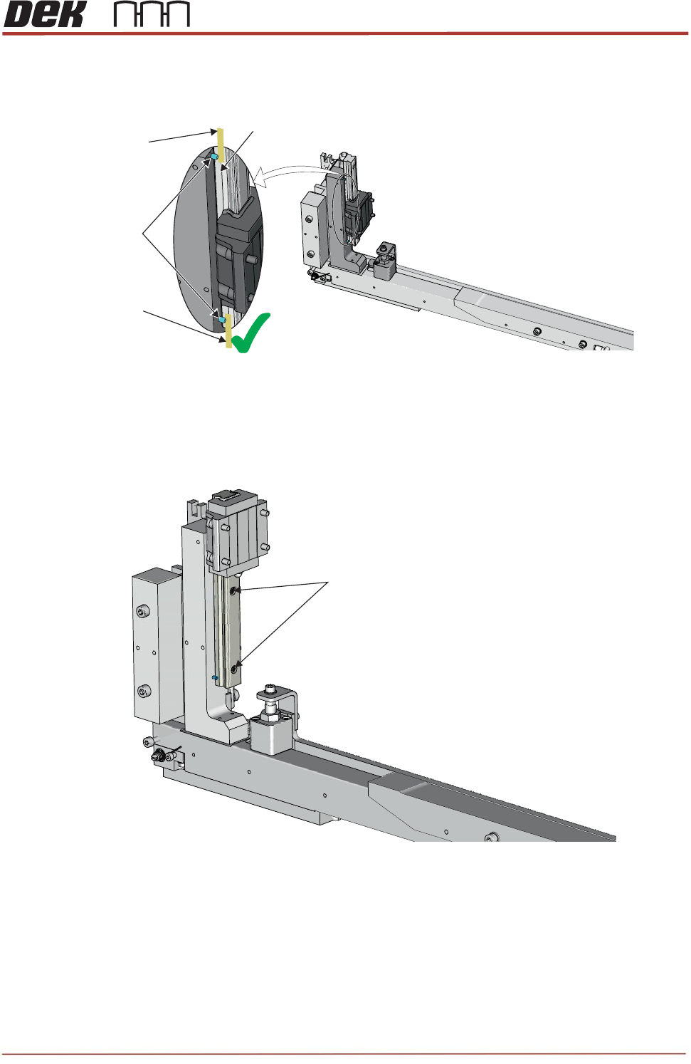 17. If 0.05mm feeler is GO, loosen the bearing rail fasteners, push the datum edge of the