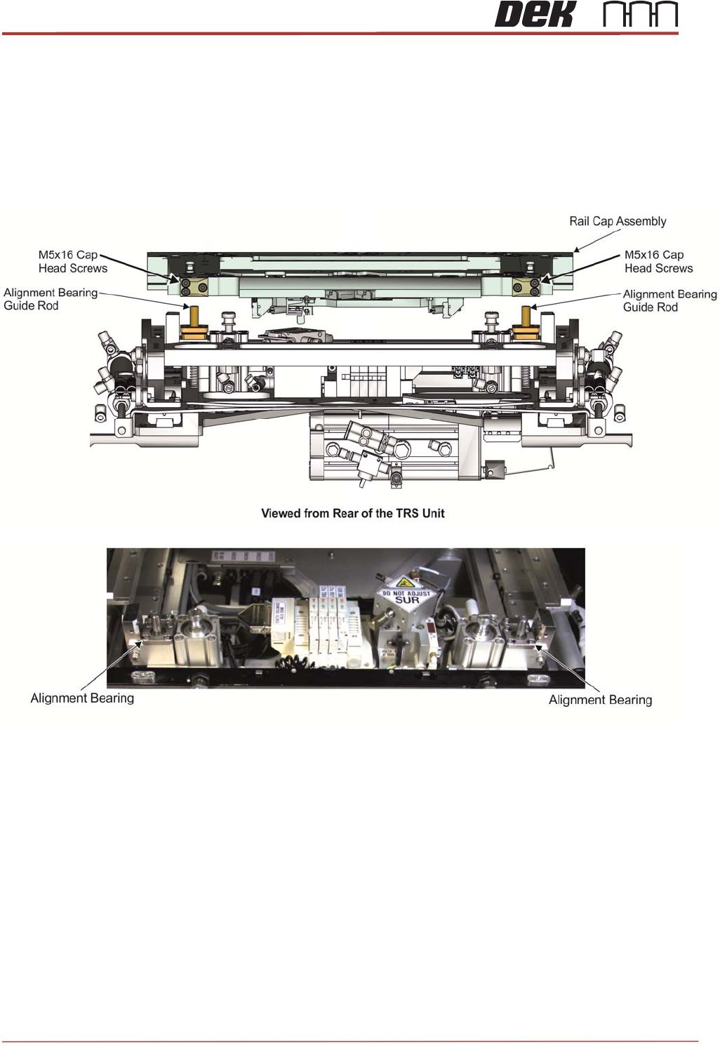 Issue 2, Nov 14 TRS Advanced Maintenance 51 35. Press the rail cap flat and tighten the 6 off M5x16 cap head clamping block screws to lock alignment bearing guide rods into position as shown below. 36. Press the Rail Cap…