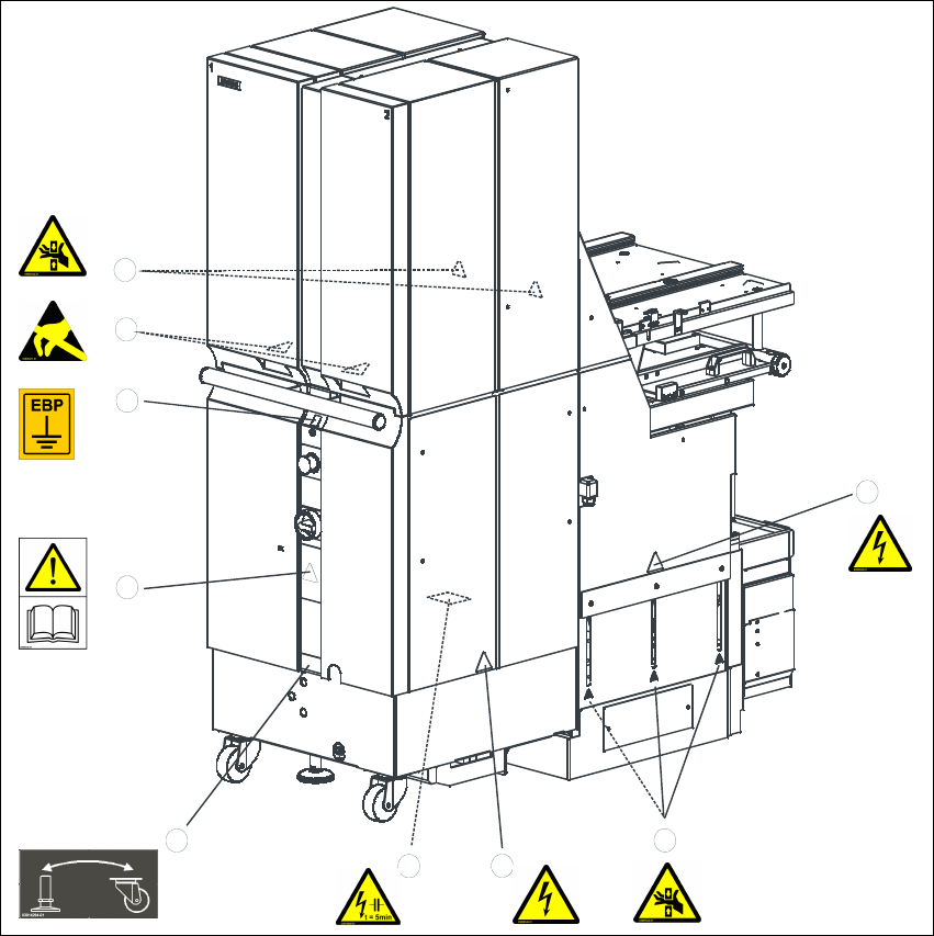 2 操作安全須知 使用手冊 MTC 2 2.1 安全㈾訊 01/2004 發行 30 2.1.7 MTC 2 ㆖的警告及㈾訊標籤 ㆘圖顯示 MTC 2 機器㆖的警告及㈾訊標籤的位置。 圖 2.1 - 1 MTC 2 的 警告標籤的位置 ( ㊨側 ) 重點 1 參閱圖 2.1 - 3 5 參閱圖 2.1 - 8 2 參閱圖 2.1 - 4 6 參閱圖 2.1 - 9 3 參閱圖 2.1 - 6 7 參閱圖 2.1 - 11 4 參閱圖 2…